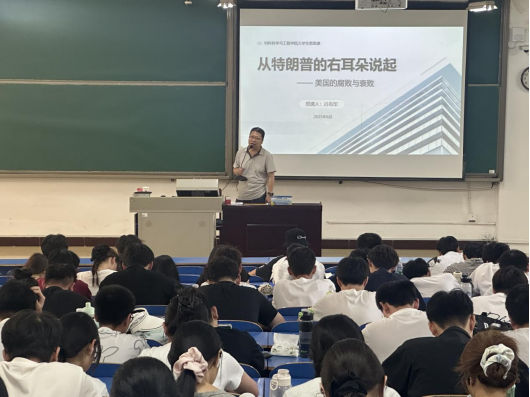 本次思政课以丰富案例引导学生认清美国腐败与衰败的制度性根源、系统性溃烂、长期化进程,鼓励同学们要坚定道路自信、理论自信、制度自信、文化自信,身处百年变局,立足本位,提高本领,为中华民族伟大复兴做出贡献。