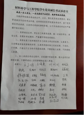 本次主题活动分为诚信主题教育、签署诚信考试承诺书两个环节。在主题教育中,党支部书记熊思彬、组织委员林嘉翔共同强调了诚信考试的重要性,要求与会的党员、入党积极分子以身作则,将诚信教育传达给身边的每一位同学,在学院中营造良好的考试风气,同时,希望大家做到认真复习,用刻苦所学真实反映学习情况,树立良好的班风、学风、考风。随后,大家积极地在诚信考试承诺书上签了自己的名字,表示将做到诚信考试,共筑良好考试风气。